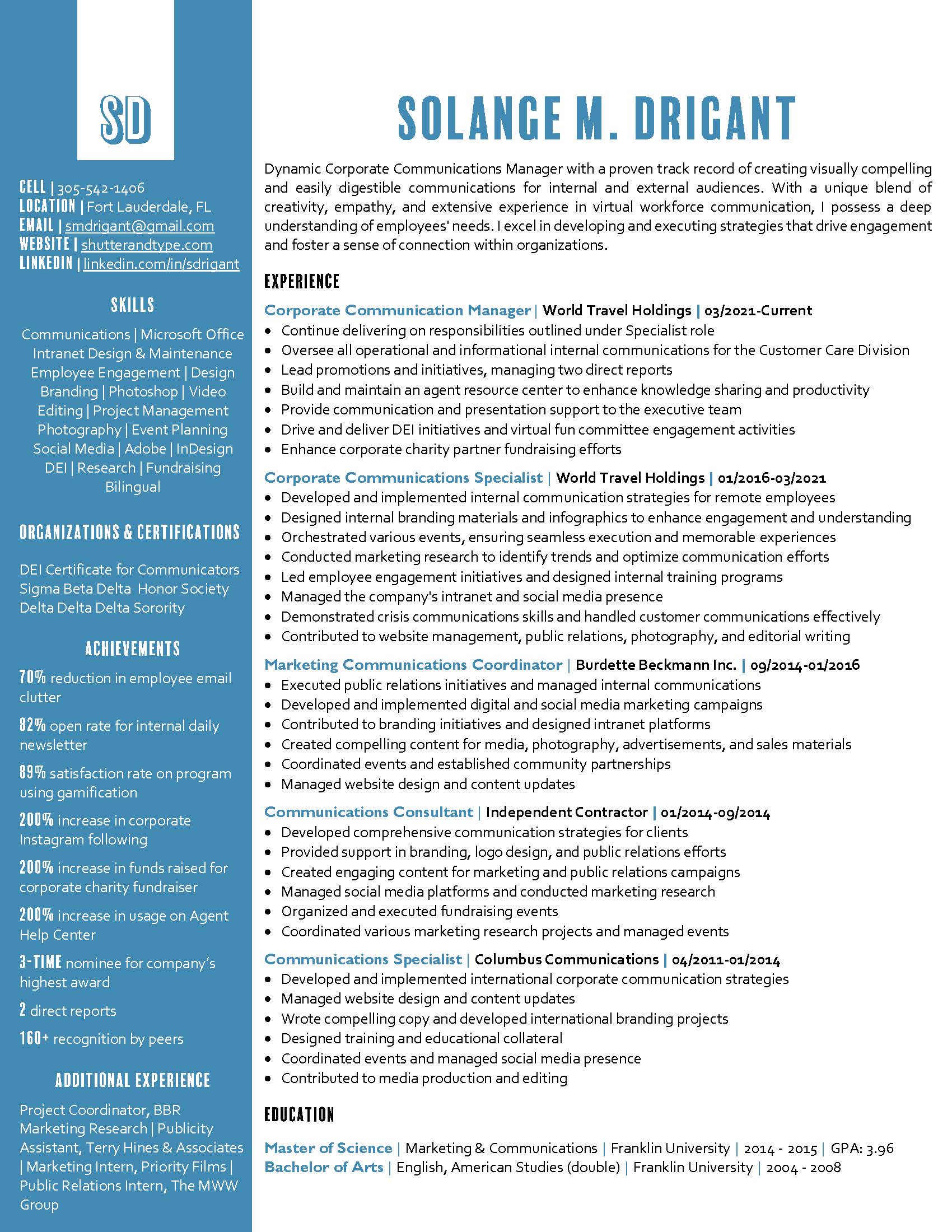 Welcome to my website! I’m a dynamic Corporate Communications Manager with a proven track record of creating visually compelling and easily digestible communications for both internal and external audiences. I bring a unique blend of creativity, empathy, and extensive experience in virtual workforce communication, which allows me to deeply understand employees’ needs. My expertise lies in developing and executing strategies that drive engagement and foster a sense of connection within organizations.